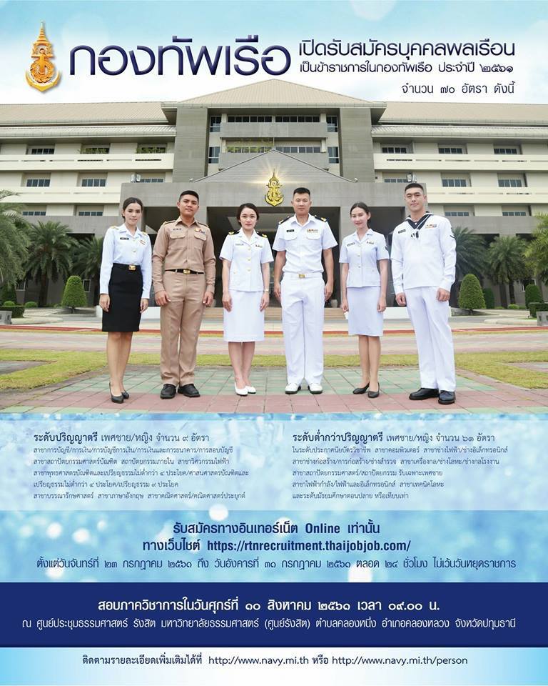 กองทัพเรือ เปิดรับสมัครบุคคลพลเรือน ทั้งเพศชายและเพศหญิงเข้าเป็นข้าราชการในกองทัพเรือ ประจำปี 2561 ในระดับปริญญาตรี และระดับต่ำกว่าปริญญาตรี จำนวน 70 อัตรา