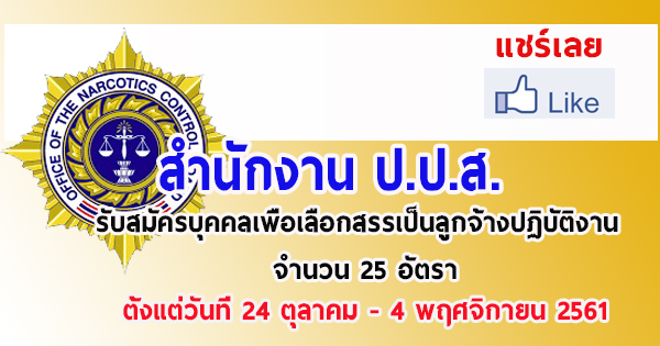 สำนักงานคณะกรรมการป้องกันและปราบปรามยาเสพติด (ป.ป.ส.) เปิดรับสมัครสอบเป็นลูกจ้าง จำนวน 25 อัตรา รับสมัครทางอินเทอร์เน็ต ตั้งแต่วันที่ 24 ตุลาคม - 4 พฤศจิกายน 2561